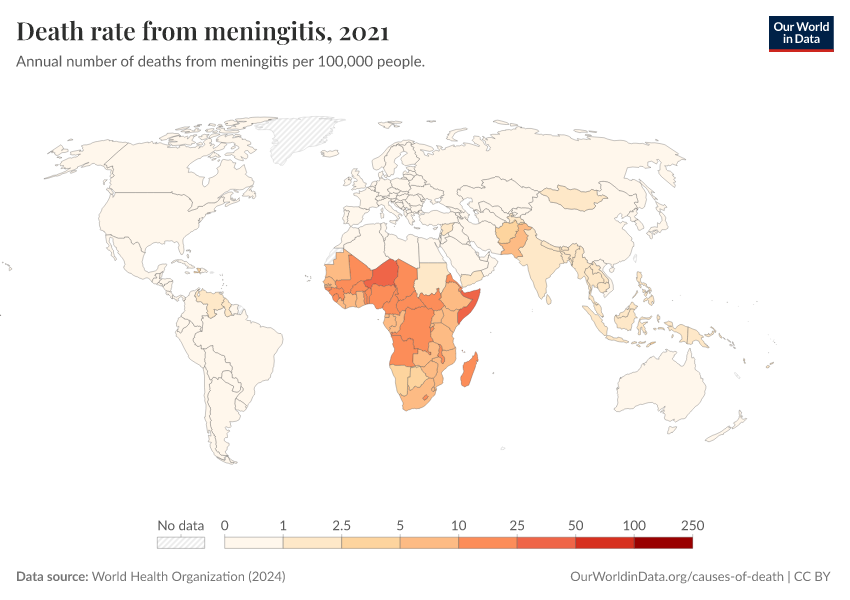 World Health Organization (2024) – with major processing by Our World in Data. “Death rate from meningitis” [dataset]. World Health Organization, “Global Health Estimates” [original data]. Retrieved March 3, 2026 from https://country-profiles-in-search.owid.pages.dev/grapher/death-rate-from-meningitis-who
