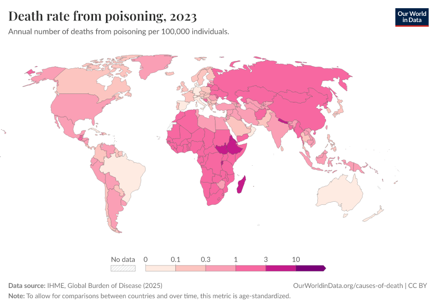 IHME, Global Burden of Disease (2025) – with major processing by Our World in Data. “Death rate from poisoning” [dataset]. IHME, Global Burden of Disease, “Global Burden of Disease - Deaths” [original data]. Retrieved March 3, 2026 from https://country-profiles-in-search.owid.pages.dev/grapher/death-rate-from-poisoning