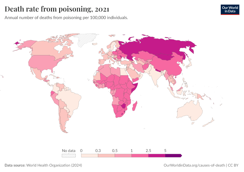 World Health Organization (2024) – with major processing by Our World in Data. “Death rate from poisoning” [dataset]. World Health Organization, “Global Health Estimates” [original data]. Retrieved March 3, 2026 from https://country-profiles-in-search.owid.pages.dev/grapher/death-rate-from-poisoning-ghe
