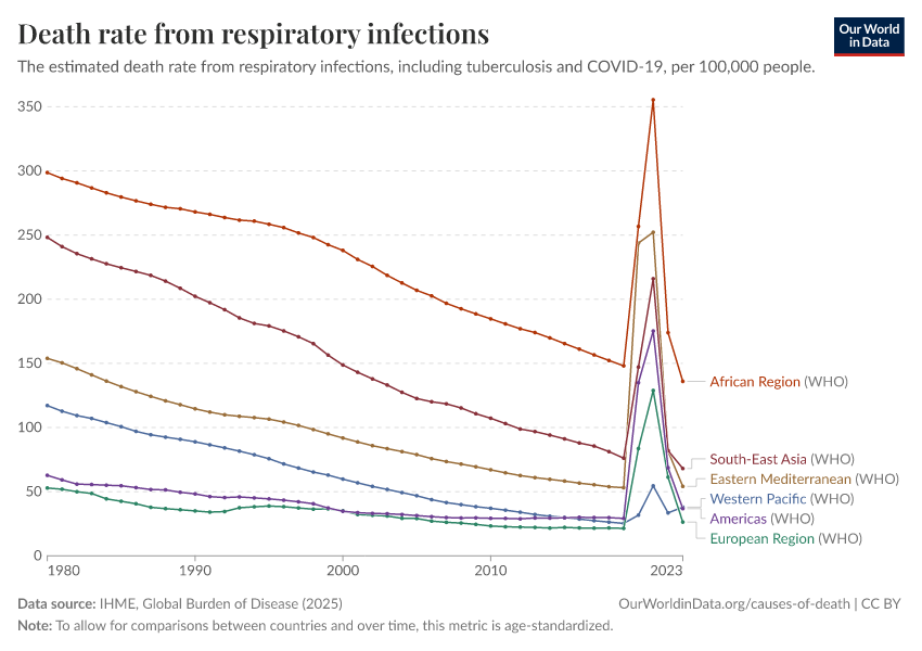 IHME, Global Burden of Disease (2025) – with major processing by Our World in Data. “Death rate from respiratory infections” [dataset]. IHME, Global Burden of Disease, “Global Burden of Disease - Deaths” [original data]. Retrieved March 3, 2026 from https://country-profiles-in-search.owid.pages.dev/grapher/death-rate-from-respiratory-infections