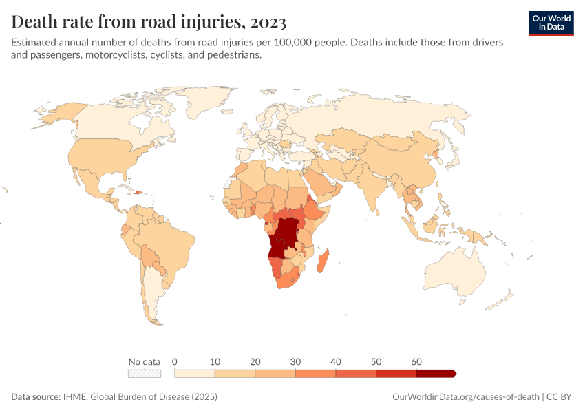 IHME, Global Burden of Disease (2025) – with major processing by Our World in Data. “Death rate from road injuries” [dataset]. IHME, Global Burden of Disease, “Global Burden of Disease - Deaths” [original data]. Retrieved March 3, 2026 from https://country-profiles-in-search.owid.pages.dev/grapher/death-rate-from-road-accidents