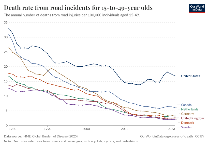 IHME, Global Burden of Disease (2025) – with major processing by Our World in Data. “Death rate from road incidents for 15-to-49-year olds” [dataset]. IHME, Global Burden of Disease, “Global Burden of Disease - Deaths” [original data]. Retrieved March 3, 2026 from https://country-profiles-in-search.owid.pages.dev/grapher/death-rate-from-road-accidents-for-15--to-49-year-olds