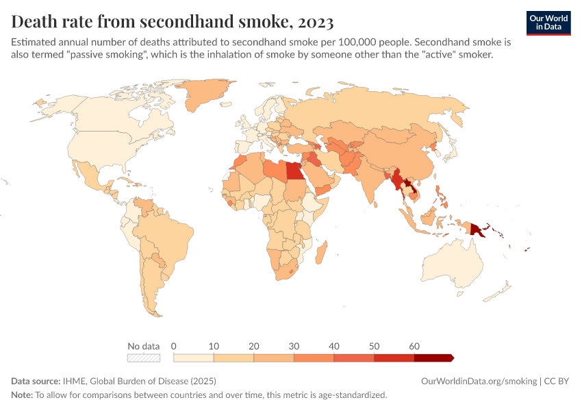 IHME, Global Burden of Disease (2025) – with major processing by Our World in Data. “Death rate from secondhand smoke” [dataset]. IHME, Global Burden of Disease, “Global Burden of Disease - Risk Factors - Deaths” [original data]. Retrieved March 3, 2026 from https://country-profiles-in-search.owid.pages.dev/grapher/death-rate-from-secondhand-smoke