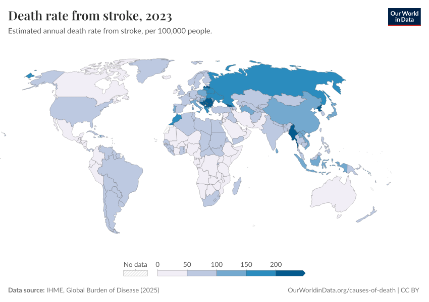 IHME, Global Burden of Disease (2025) – with major processing by Our World in Data. “Death rate from stroke” [dataset]. IHME, Global Burden of Disease, “Global Burden of Disease - Deaths” [original data]. Retrieved March 3, 2026 from https://country-profiles-in-search.owid.pages.dev/grapher/death-rate-from-strokes
