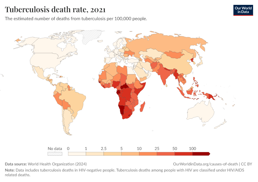 World Health Organization (2024) – with major processing by Our World in Data. “Tuberculosis death rate” [dataset]. World Health Organization, “Global Health Estimates” [original data]. Retrieved March 3, 2026 from https://country-profiles-in-search.owid.pages.dev/grapher/death-rate-from-tuberculosis-ghe