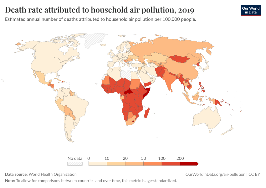 World Health Organization – processed by Our World in Data. “Death rate attributed to household air pollution” [dataset]. World Health Organization, “Global Health Observatory (GHO), World Health Organisation (WHO)” [original data]. Retrieved March 3, 2026 from https://country-profiles-in-search.owid.pages.dev/grapher/death-rate-household-air-pollution