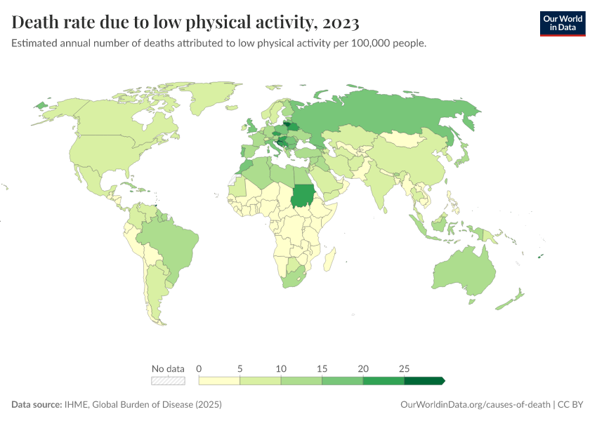 “Data Page: Death rate due to low physical activity”, part of the following publication: Esteban Ortiz-Ospina and Max Roser (2016) - “Global Health”. Data adapted from IHME, Global Burden of Disease. Retrieved from https://country-profiles-in-search.owid.pages.dev/grapher/death-rates-due-to-low-physical-activity-gbd [online resource]How to cite this data