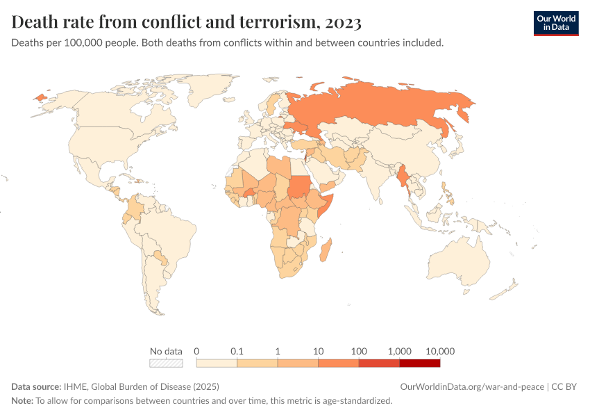 IHME, Global Burden of Disease (2025) – with major processing by Our World in Data. “Death rate from conflict and terrorism” [dataset]. IHME, Global Burden of Disease, “Global Burden of Disease - Deaths” [original data]. Retrieved March 3, 2026 from https://country-profiles-in-search.owid.pages.dev/grapher/death-rates-from-conflict-and-terrorism-gbd