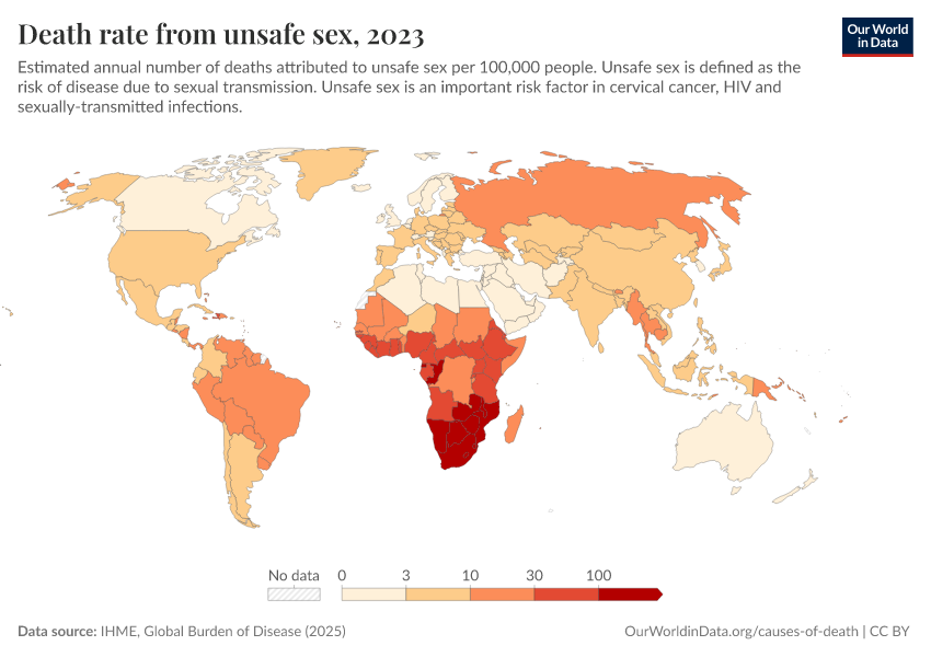 IHME, Global Burden of Disease (2025) – with major processing by Our World in Data. “Death rate from unsafe sex” [dataset]. IHME, Global Burden of Disease, “Global Burden of Disease - Risk Factors - Deaths” [original data]. Retrieved March 3, 2026 from https://country-profiles-in-search.owid.pages.dev/grapher/death-rates-from-unsafe-sex-gbd