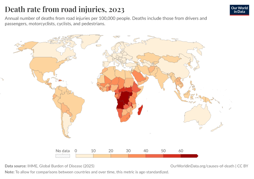 IHME, Global Burden of Disease (2025) – with major processing by Our World in Data. “Death rate from road injuries” [dataset]. IHME, Global Burden of Disease, “Global Burden of Disease - Deaths” [original data]. Retrieved March 3, 2026 from https://country-profiles-in-search.owid.pages.dev/grapher/death-rates-road-incidents
