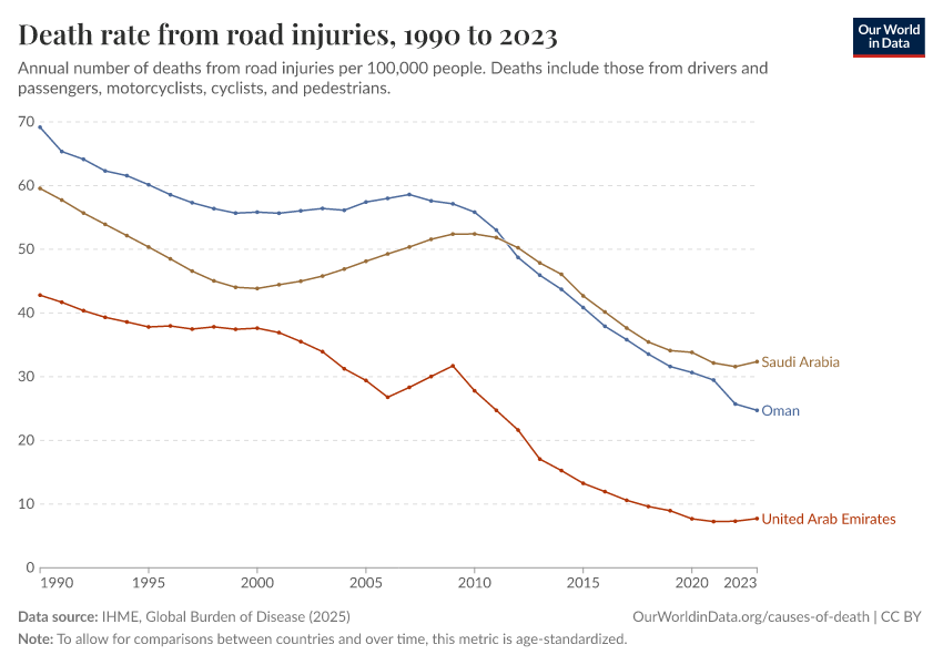 IHME, Global Burden of Disease (2025) – with major processing by Our World in Data. “Death rate from road injuries” [dataset]. IHME, Global Burden of Disease, “Global Burden of Disease - Deaths” [original data]. Retrieved March 3, 2026 from https://country-profiles-in-search.owid.pages.dev/grapher/death-rates-road-incidents