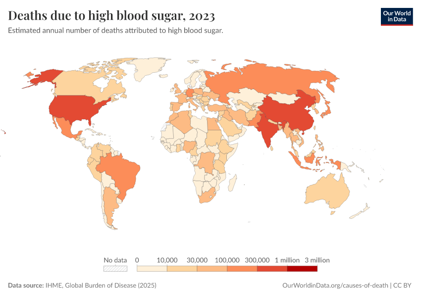 IHME, Global Burden of Disease (2025) – with major processing by Our World in Data. “Deaths due to high blood sugar” [dataset]. IHME, Global Burden of Disease, “Global Burden of Disease - Risk Factors - Deaths” [original data]. Retrieved March 3, 2026 from https://country-profiles-in-search.owid.pages.dev/grapher/deaths-due-to-high-blood-sugar