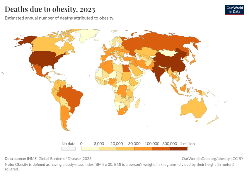 IHME, Global Burden of Disease (2025) – with major processing by Our World in Data. “Deaths due to obesity” [dataset]. IHME, Global Burden of Disease, “Global Burden of Disease - Risk Factors - Deaths” [original data]. Retrieved March 3, 2026 from https://country-profiles-in-search.owid.pages.dev/grapher/deaths-due-to-obesity
