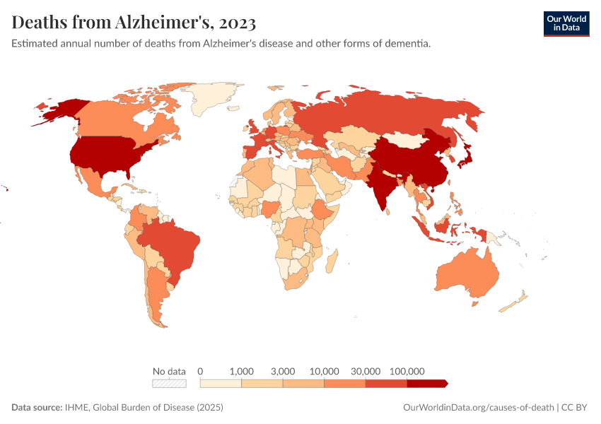 “Data Page: Deaths from Alzheimer's”, part of the following publication: Esteban Ortiz-Ospina and Max Roser (2016) - “Global Health”. Data adapted from IHME, Global Burden of Disease. Retrieved from https://country-profiles-in-search.owid.pages.dev/grapher/deaths-from-alzheimers [online resource]How to cite this data