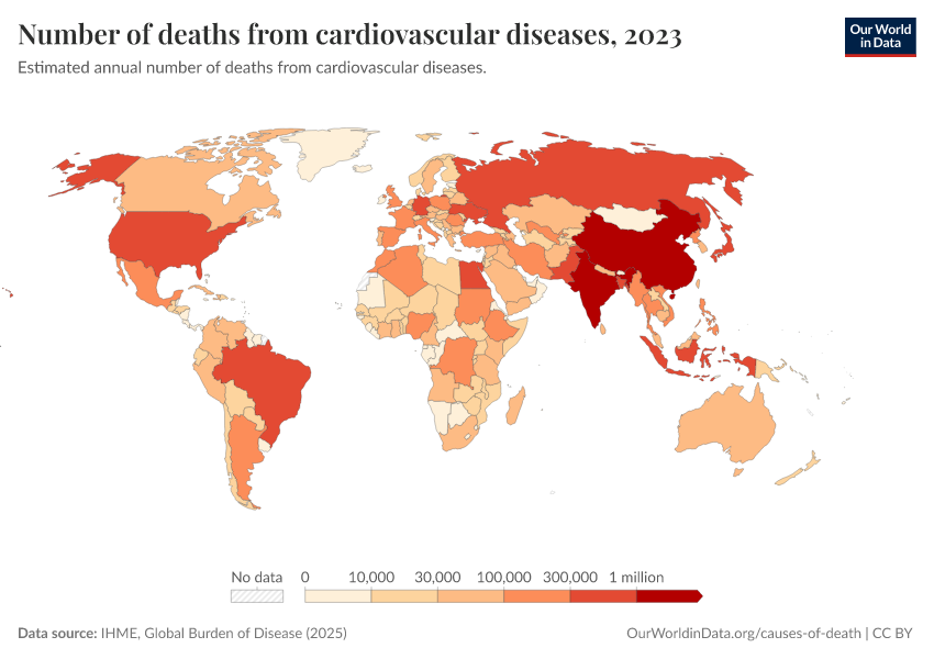 IHME, Global Burden of Disease (2025) – with major processing by Our World in Data. “Number of deaths from cardiovascular diseases” [dataset]. IHME, Global Burden of Disease, “Global Burden of Disease - Deaths” [original data]. Retrieved March 3, 2026 from https://country-profiles-in-search.owid.pages.dev/grapher/deaths-from-cardiovascular-disease