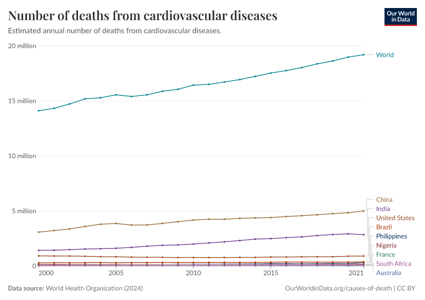 World Health Organization (2024) – with major processing by Our World in Data. “Number of deaths from cardiovascular diseases” [dataset]. World Health Organization, “Global Health Estimates” [original data]. Retrieved March 3, 2026 from https://country-profiles-in-search.owid.pages.dev/grapher/deaths-from-cardiovascular-disease-ghe