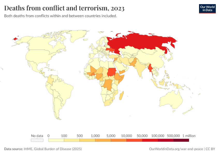 IHME, Global Burden of Disease (2025) – with major processing by Our World in Data. “Deaths from conflict and terrorism” [dataset]. IHME, Global Burden of Disease, “Global Burden of Disease - Deaths” [original data]. Retrieved March 3, 2026 from https://country-profiles-in-search.owid.pages.dev/grapher/deaths-from-conflict-and-terrorism