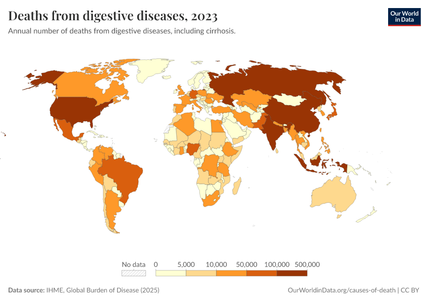 IHME, Global Burden of Disease (2025) – with major processing by Our World in Data. “Deaths from digestive diseases” [dataset]. IHME, Global Burden of Disease, “Global Burden of Disease - Deaths” [original data]. Retrieved March 3, 2026 from https://country-profiles-in-search.owid.pages.dev/grapher/deaths-from-digestive-diseases