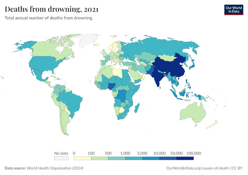 World Health Organization (2024) – with major processing by Our World in Data. “Deaths from drowning” [dataset]. World Health Organization, “Global Health Estimates” [original data]. Retrieved March 3, 2026 from https://country-profiles-in-search.owid.pages.dev/grapher/deaths-from-drowning-ghe