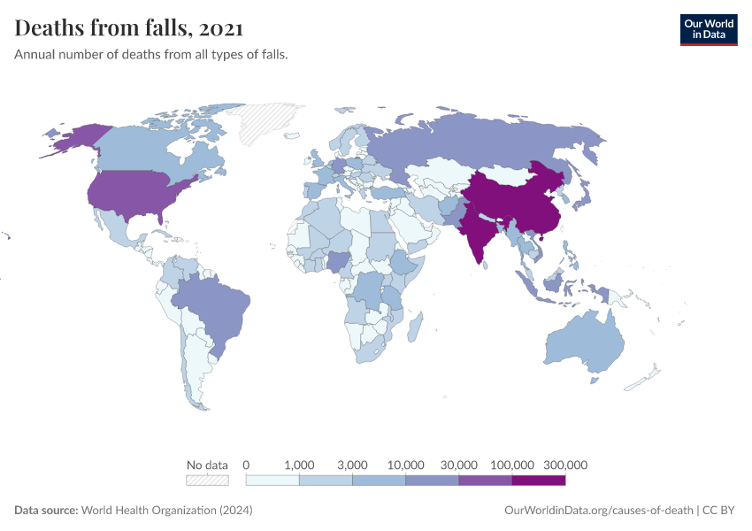 World Health Organization (2024) – with major processing by Our World in Data. “Deaths from falls” [dataset]. World Health Organization, “Global Health Estimates” [original data]. Retrieved March 3, 2026 from https://country-profiles-in-search.owid.pages.dev/grapher/deaths-from-falls