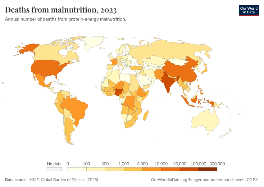 IHME, Global Burden of Disease (2025) – with major processing by Our World in Data. “Deaths from malnutrition” [dataset]. IHME, Global Burden of Disease, “Global Burden of Disease - Deaths” [original data]. Retrieved March 3, 2026 from https://country-profiles-in-search.owid.pages.dev/grapher/deaths-from-malnutrition