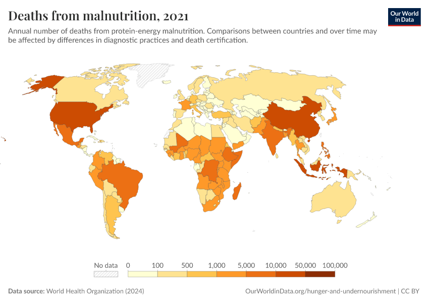 World Health Organization (2024) – with major processing by Our World in Data. “Deaths from malnutrition” [dataset]. World Health Organization, “Global Health Estimates” [original data]. Retrieved March 3, 2026 from https://country-profiles-in-search.owid.pages.dev/grapher/deaths-from-malnutrition-ghe
