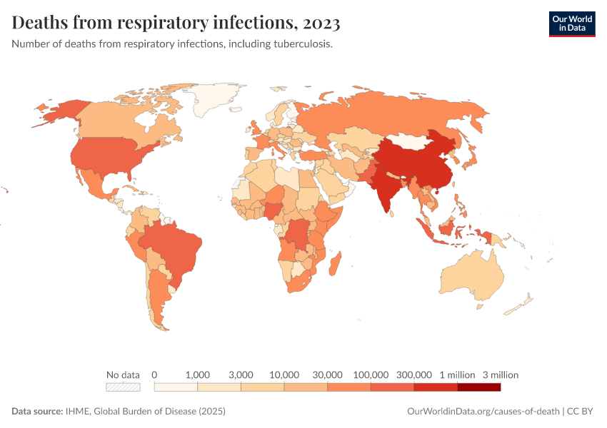 IHME, Global Burden of Disease (2025) – with major processing by Our World in Data. “Deaths from respiratory infections” [dataset]. IHME, Global Burden of Disease, “Global Burden of Disease - Deaths” [original data]. Retrieved March 3, 2026 from https://country-profiles-in-search.owid.pages.dev/grapher/deaths-from-respiratory-infections