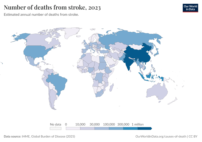 IHME, Global Burden of Disease (2025) – with major processing by Our World in Data. “Number of deaths from stroke” [dataset]. IHME, Global Burden of Disease, “Global Burden of Disease - Deaths” [original data]. Retrieved March 3, 2026 from https://country-profiles-in-search.owid.pages.dev/grapher/deaths-from-strokes