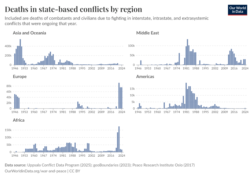 Uppsala Conflict Data Program (2025); geoBoundaries (2023); Peace Research Institute Oslo (2017) – processed by Our World in Data. “Deaths in state-based conflicts by region” [dataset]. Uppsala Conflict Data Program, “Georeferenced Event Dataset v25.1”; geoBoundaries, “geoBoundaries - Comprehensive Global Administrative Zones (CGAZ) 6.0.0”; Peace Research Institute Oslo, “Battle deaths v3.1” [original data]. Retrieved March 3, 2026 from https://country-profiles-in-search.owid.pages.dev/grapher/deaths-in-state-based-conflicts-by-region