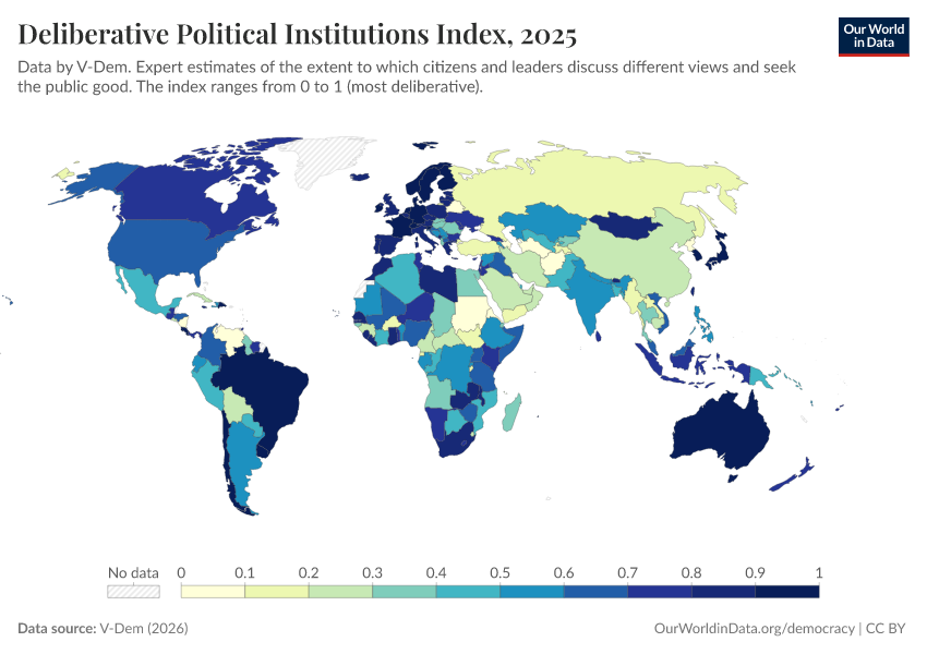 V-Dem (2025) – processed by Our World in Data. “Deliberative political institutions index – V-Dem” [dataset]. V-Dem, “Democracy report v15” [original data]. Retrieved March 3, 2026 from https://country-profiles-in-search.owid.pages.dev/grapher/deliberative-political-institutions-index