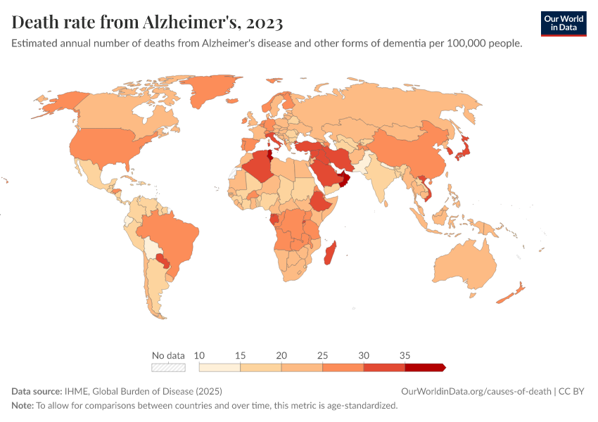 IHME, Global Burden of Disease (2025) – with major processing by Our World in Data. “Death rate from Alzheimer's” [dataset]. IHME, Global Burden of Disease, “Global Burden of Disease - Deaths” [original data]. Retrieved March 3, 2026 from https://country-profiles-in-search.owid.pages.dev/grapher/dementia-death-rates