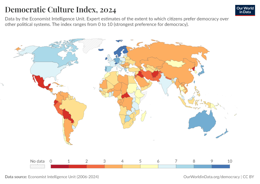 Economist Intelligence Unit (2006-2024) – processed by Our World in Data. “Democratic Culture Index” [dataset]. Economist Intelligence Unit, “Democracy Index 2021: The China challenge”; Economist Intelligence Unit, “Democracy Index 2022: Frontline democracy and the battle for Ukraine”; Economist Intelligence Unit, “Democracy Index 2023: Age of Conflict”; Economist Intelligence Unit, “Democracy Index 2024: What's wrong with representative democracy?”; Gapminder, “Democracy Index v4”; Various sources, “Population” [original data]. Retrieved March 3, 2026 from https://country-profiles-in-search.owid.pages.dev/grapher/democratic-culture-index-eiu