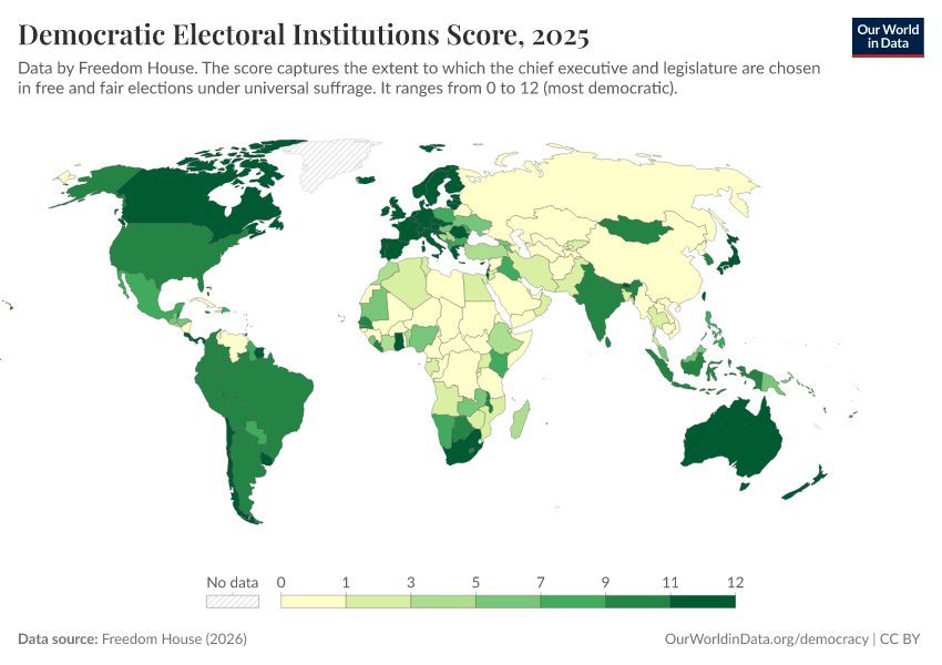 Freedom House (2025) – processed by Our World in Data. “Democratic Electoral Institutions Score” [dataset]. Freedom House, “Freedom in the World” [original data]. Retrieved March 3, 2026 from https://country-profiles-in-search.owid.pages.dev/grapher/democratic-electoral-institutions-fh