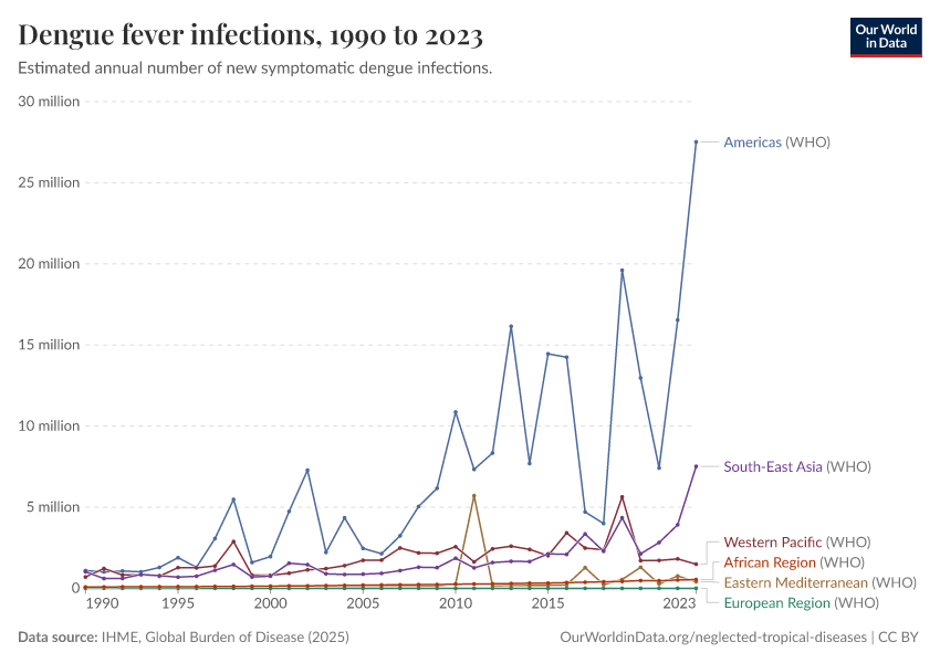 IHME, Global Burden of Disease (2025) – with major processing by Our World in Data. “Dengue fever infections” [dataset]. IHME, Global Burden of Disease, “Global Burden of Disease - Prevalence and Incidence” [original data]. Retrieved March 3, 2026 from https://country-profiles-in-search.owid.pages.dev/grapher/dengue-incidence
