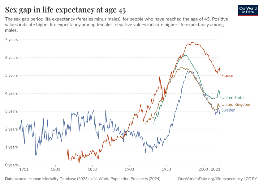 Human Mortality Database (2025); UN, World Population Prospects (2024) – with major processing by Our World in Data. “Life expectancy at 45 – HMD – female-male difference, period tables” [dataset]. Human Mortality Database, “Human Mortality Database”; United Nations, “World Population Prospects” [original data]. Retrieved March 3, 2026 from https://country-profiles-in-search.owid.pages.dev/grapher/difference-in-female-and-male-life-expectancy-at-age-45