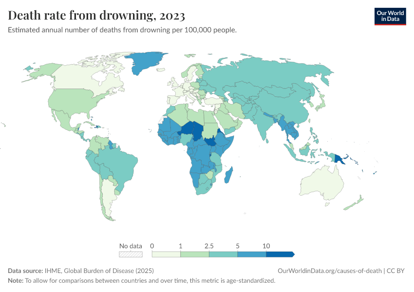 IHME, Global Burden of Disease (2025) – with major processing by Our World in Data. “Death rate from drowning” [dataset]. IHME, Global Burden of Disease, “Global Burden of Disease - Deaths” [original data]. Retrieved March 3, 2026 from https://country-profiles-in-search.owid.pages.dev/grapher/drowning-death-rates