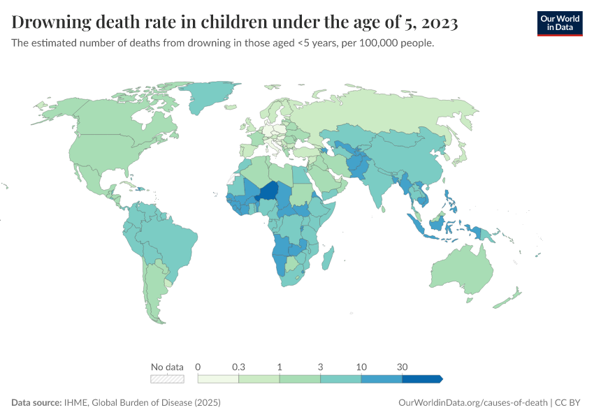 IHME, Global Burden of Disease (2025) – with major processing by Our World in Data. “Drowning death rate in children under the age of 5” [dataset]. IHME, Global Burden of Disease, “Global Burden of Disease - Deaths” [original data]. Retrieved March 3, 2026 from https://country-profiles-in-search.owid.pages.dev/grapher/drowning-death-rates-under-5