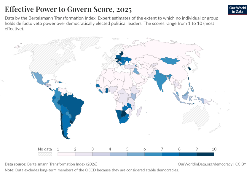 “Data Page: Effective Power to Govern Score”, part of the following publication: Bastian Herre, Lucas Rodés-Guirao, and Esteban Ortiz-Ospina (2013) - “Democracy”. Data adapted from Bertelsmann Transformation Index. Retrieved from https://country-profiles-in-search.owid.pages.dev/grapher/effective-power-to-govern-score-bti [online resource]How to cite this data