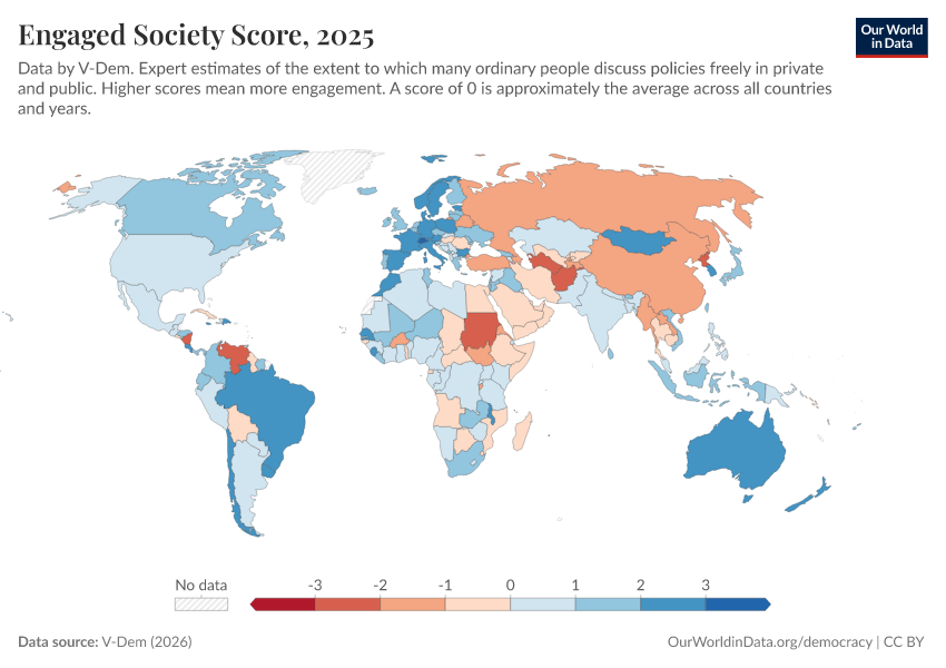 V-Dem (2025) – processed by Our World in Data. “Engaged society – V-Dem” [dataset]. V-Dem, “Democracy report v15” [original data]. Retrieved March 3, 2026 from https://country-profiles-in-search.owid.pages.dev/grapher/engaged-society-score
