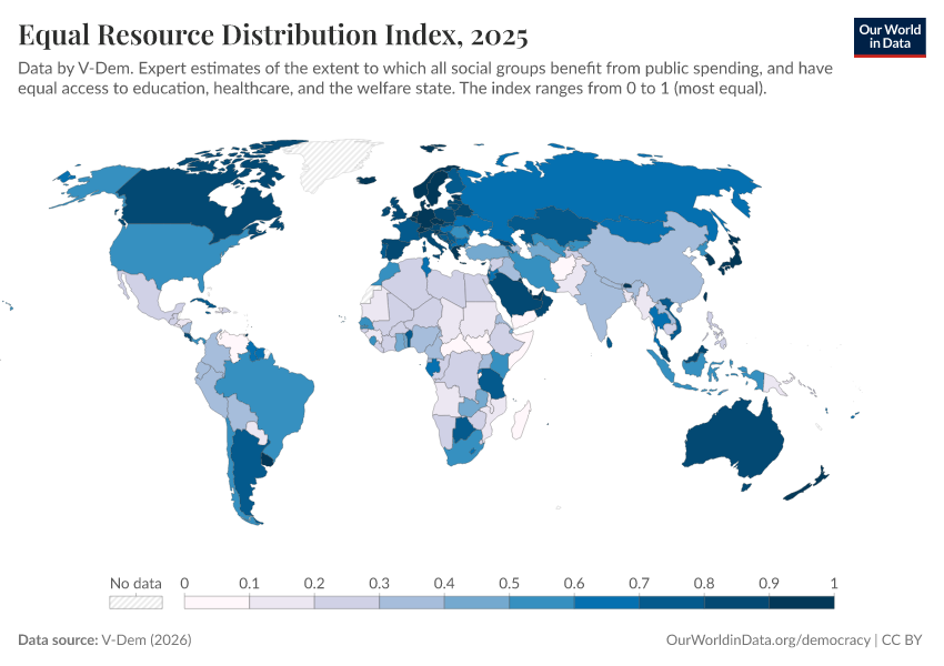 V-Dem (2025) – processed by Our World in Data. “Equal resource distribution index – V-Dem” [dataset]. V-Dem, “Democracy report v15” [original data]. Retrieved March 3, 2026 from https://country-profiles-in-search.owid.pages.dev/grapher/equal-resource-distribution-index