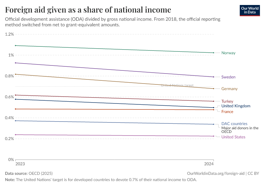 OECD (2025) – with minor processing by Our World in Data. “Foreign aid given as a share of national income – Official estimate” [dataset]. OECD, “OECD Official Development Assistance (ODA) - DAC1: Flows by provider (ODA+OOF+Private)” [original data]. Retrieved March 3, 2026 from https://country-profiles-in-search.owid.pages.dev/grapher/foreign-aid-given-as-a-share-of-national-income