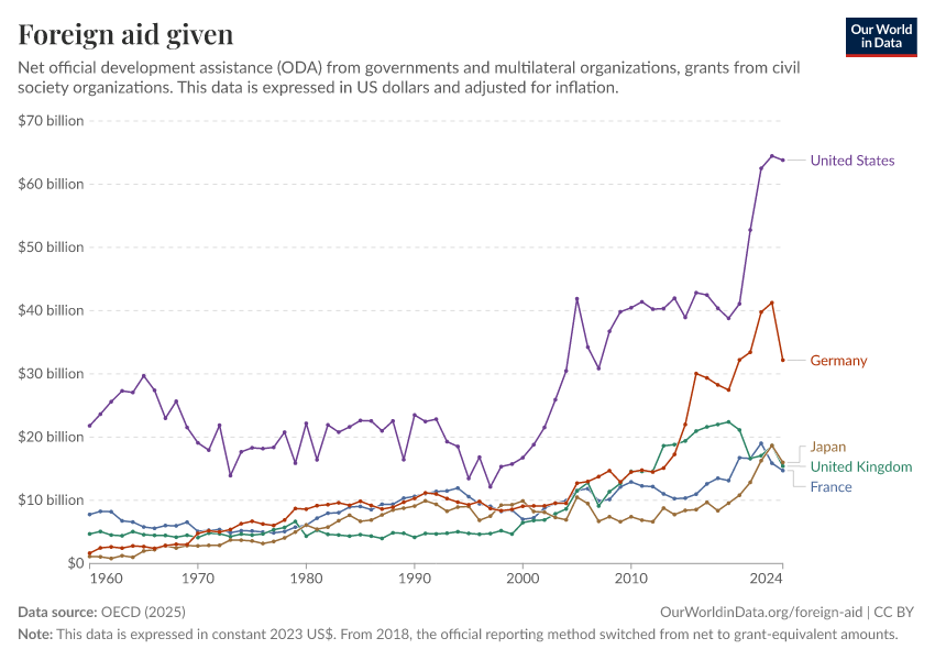 OECD (2025) – with major processing by Our World in Data. “Foreign aid given – Net disbursements” [dataset]. OECD, “OECD Official Development Assistance (ODA) - DAC1: Flows by provider (ODA+OOF+Private)”; OECD, “OECD Official Development Assistance (ODA) - DAC2A: Aid (ODA) disbursements to countries and regions” [original data]. Retrieved March 3, 2026 from https://country-profiles-in-search.owid.pages.dev/grapher/foreign-aid-given-net