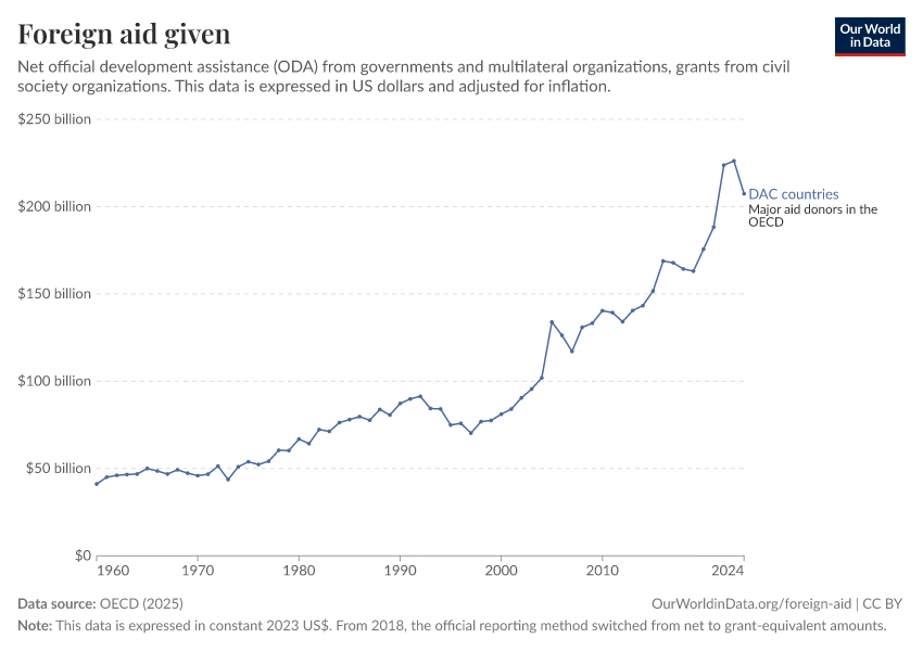 OECD (2025) – with major processing by Our World in Data. “Foreign aid given – Net disbursements” [dataset]. OECD, “OECD Official Development Assistance (ODA) - DAC1: Flows by provider (ODA+OOF+Private)”; OECD, “OECD Official Development Assistance (ODA) - DAC2A: Aid (ODA) disbursements to countries and regions” [original data]. Retrieved March 3, 2026 from https://country-profiles-in-search.owid.pages.dev/grapher/foreign-aid-given-net