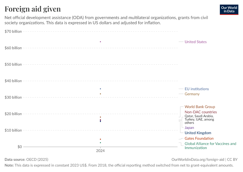 OECD (2025) – with major processing by Our World in Data. “Foreign aid given – Net disbursements” [dataset]. OECD, “OECD Official Development Assistance (ODA) - DAC1: Flows by provider (ODA+OOF+Private)”; OECD, “OECD Official Development Assistance (ODA) - DAC2A: Aid (ODA) disbursements to countries and regions” [original data]. Retrieved March 3, 2026 from https://country-profiles-in-search.owid.pages.dev/grapher/foreign-aid-given-net