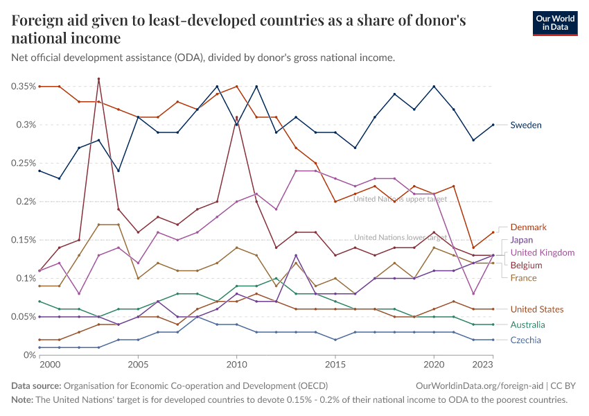 Organisation for Economic Co-operation and Development – processed by Our World in Data. “Foreign aid given to least-developed countries as a share of donor's national income” [dataset]. Organisation for Economic Co-operation and Development, “The Organisation for Economic Co-operation and Development (OECD).” [original data]. Retrieved March 3, 2026 from https://country-profiles-in-search.owid.pages.dev/grapher/foreign-aid-given-to-least-developed-countries-as-a-share-of-donors-national-income