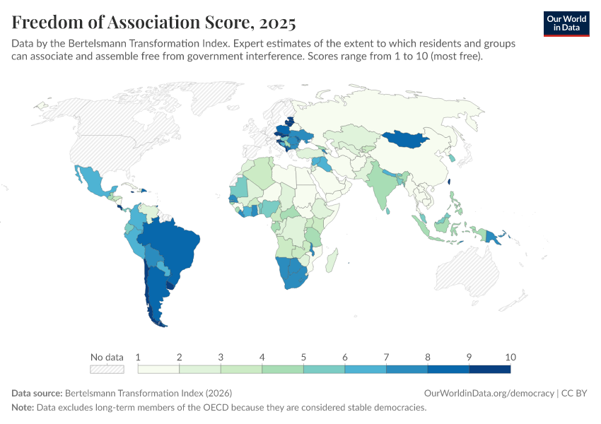 “Data Page: Freedom of Association Score”, part of the following publication: Bastian Herre, Lucas Rodés-Guirao, and Esteban Ortiz-Ospina (2013) - “Democracy”. Data adapted from Bertelsmann Transformation Index. Retrieved from https://country-profiles-in-search.owid.pages.dev/grapher/freedom-of-association-score-bti [online resource]How to cite this data