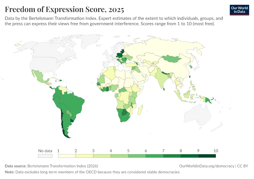 “Data Page: Freedom of Expression Score”, part of the following publication: Bastian Herre, Lucas Rodés-Guirao, and Esteban Ortiz-Ospina (2013) - “Democracy”. Data adapted from Bertelsmann Transformation Index. Retrieved from https://country-profiles-in-search.owid.pages.dev/grapher/freedom-of-expression-score-bti [online resource]How to cite this data