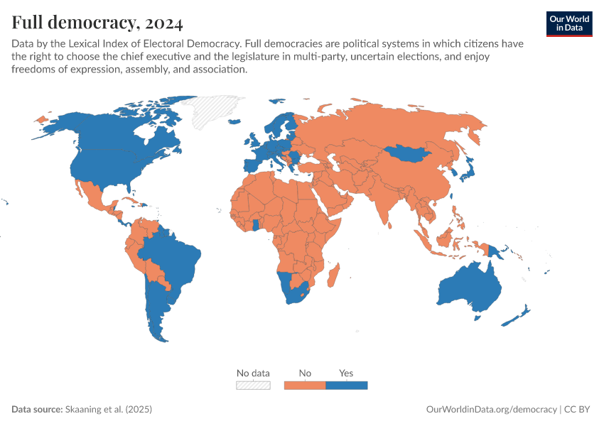 Skaaning et al. (2025) – processed by Our World in Data. “Full democracy” [dataset]. Skaaning et al., “Lexical Index of Electoral Democracy (LIED) v6.8” [original data]. Retrieved March 3, 2026 from https://country-profiles-in-search.owid.pages.dev/grapher/full-democracy-lexical