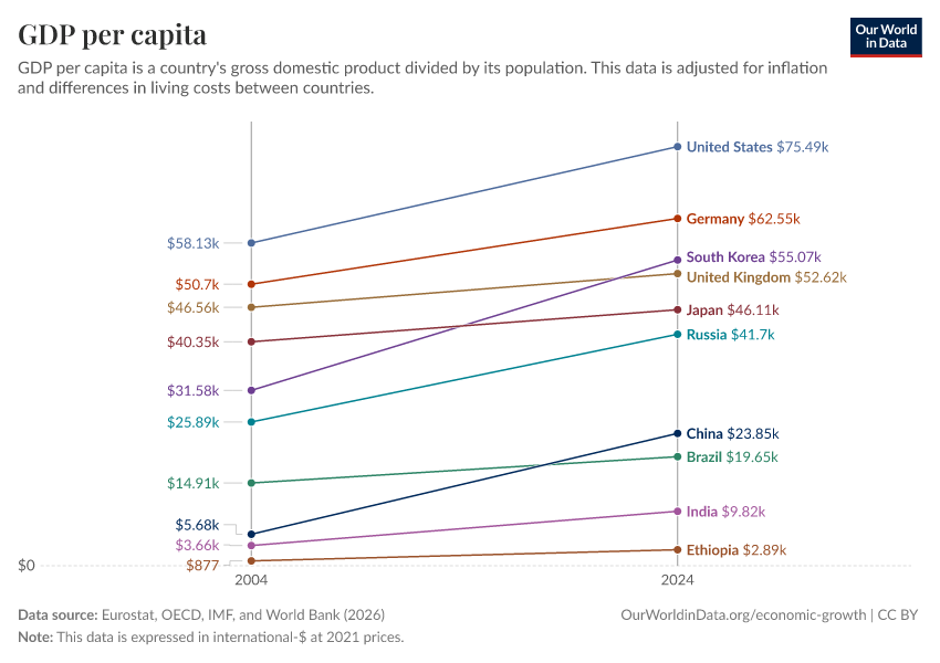 “Data Page: GDP per capita”, part of the following publication: Max Roser, Bertha Rohenkohl, Pablo Arriagada, Joe Hasell, Hannah Ritchie, and Esteban Ortiz-Ospina (2023) - “Economic Growth”. Data adapted from Eurostat, OECD, IMF, and World Bank. Retrieved from https://country-profiles-in-search.owid.pages.dev/grapher/gdp-per-capita-worldbank [online resource]