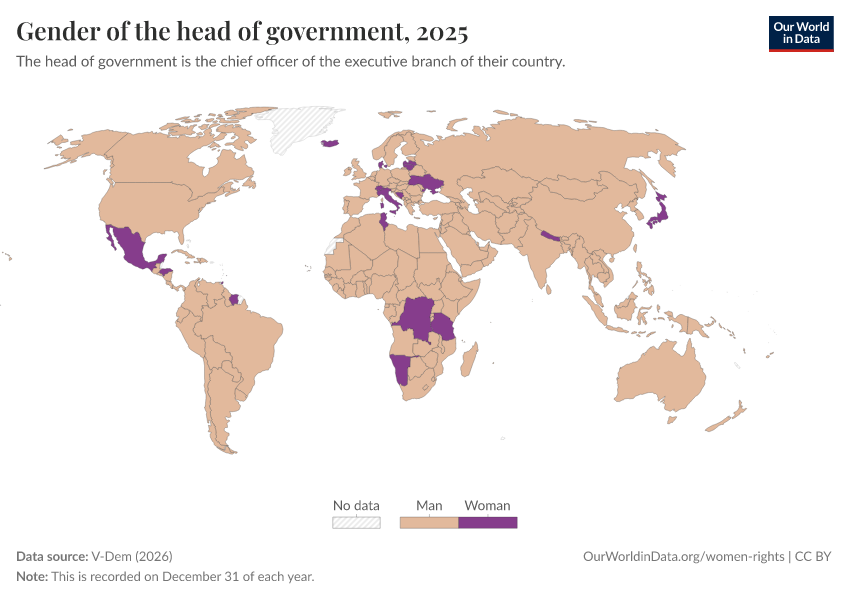 V-Dem (2025) – processed by Our World in Data. “Gender of the head of government” [dataset]. V-Dem, “Democracy report v15” [original data]. Retrieved March 3, 2026 from https://country-profiles-in-search.owid.pages.dev/grapher/gender-of-the-head-of-government